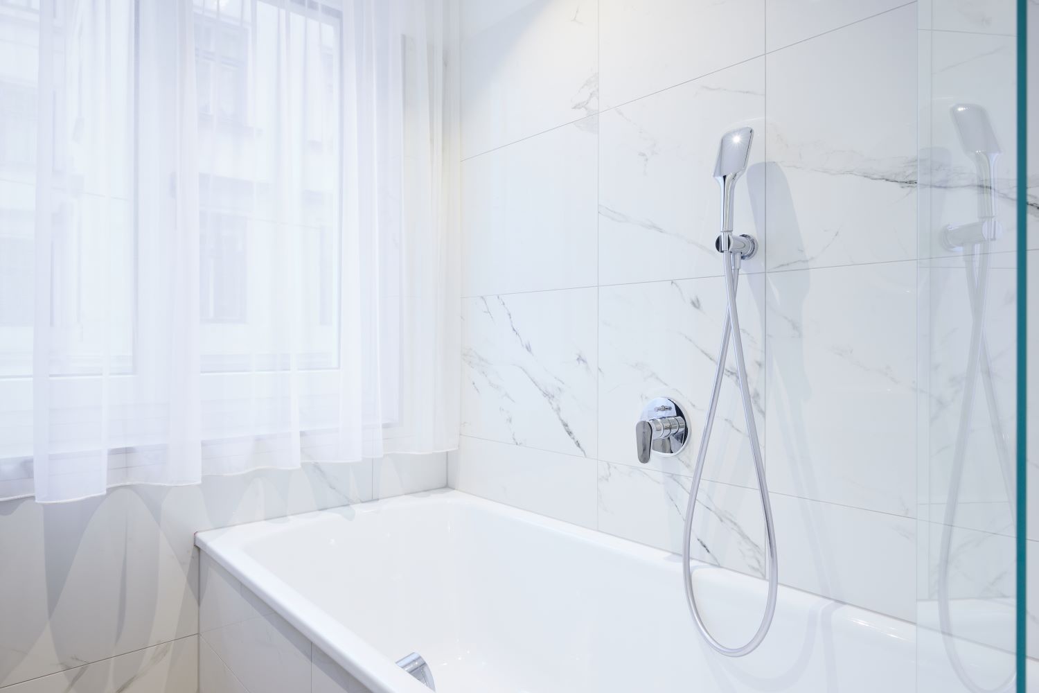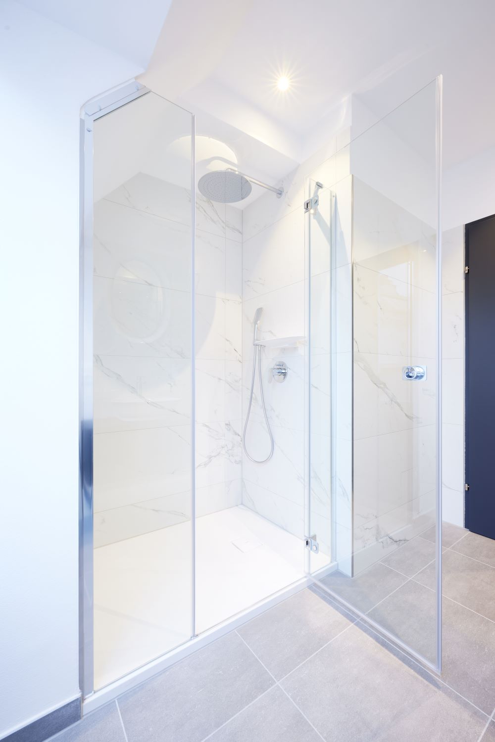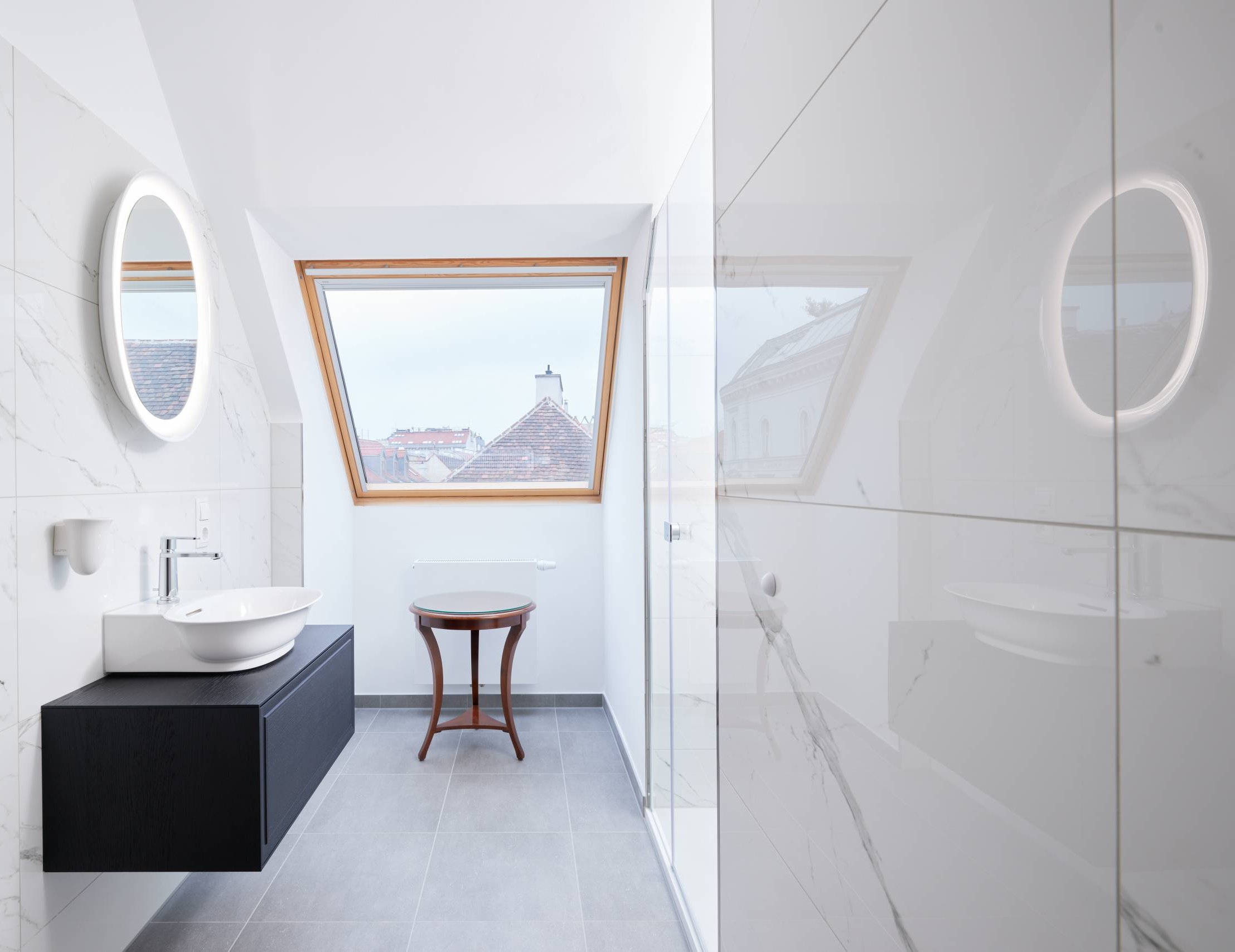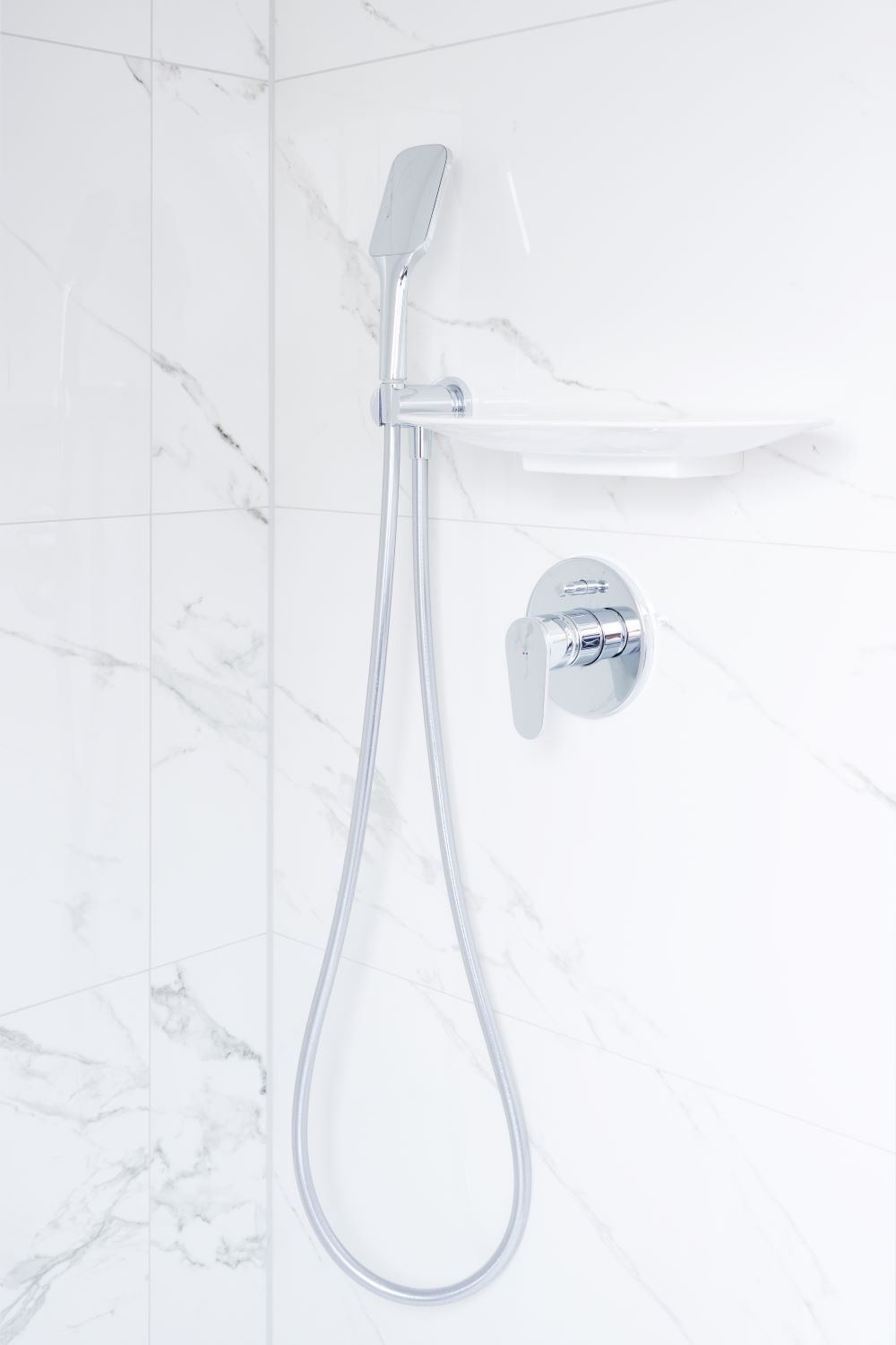 Auch bei den Badezimmer-Accessoires fiel die Wahl auf die feine Designkollektion THE NEW CLASSIC. Der Zahnputzbecher und die Bürstengarnitur scheinen vor der Wand zu schweben und erinnern in ihrer Form an weiße Tulpenköpfe. Der elegante keramische Spiegel fügt sich harmonisch in das Gesamtbild des Badezimmers ein. Die Duschtassen aus Marbond, die Armaturen und Handbrausen – ebenfalls von LAUFEN – runden das Design perfekt ab.