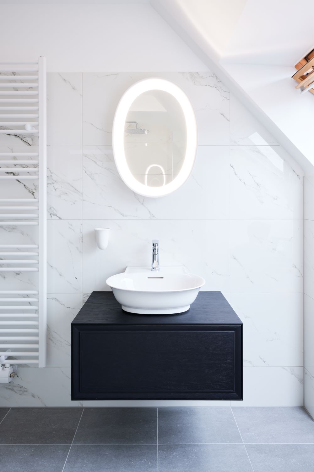 THE NEW CLASSIC verbindet Klassik mit Moderne. Das freistehende Waschbecken auf dem dunklen, minimalistischen Badezimmerschrank erinnert an historische Waschtische, während das geradlinige Design von Möbel und Waschtisch-Mischer eine zeitgemäße Note verleiht.