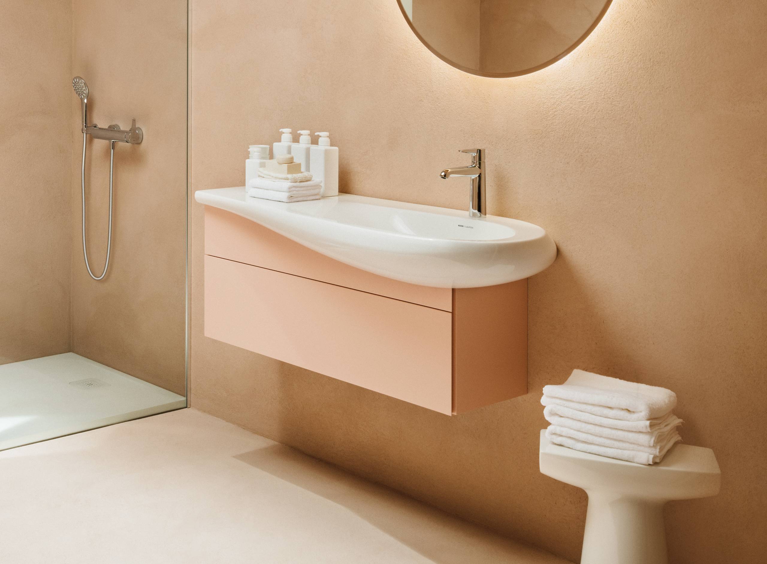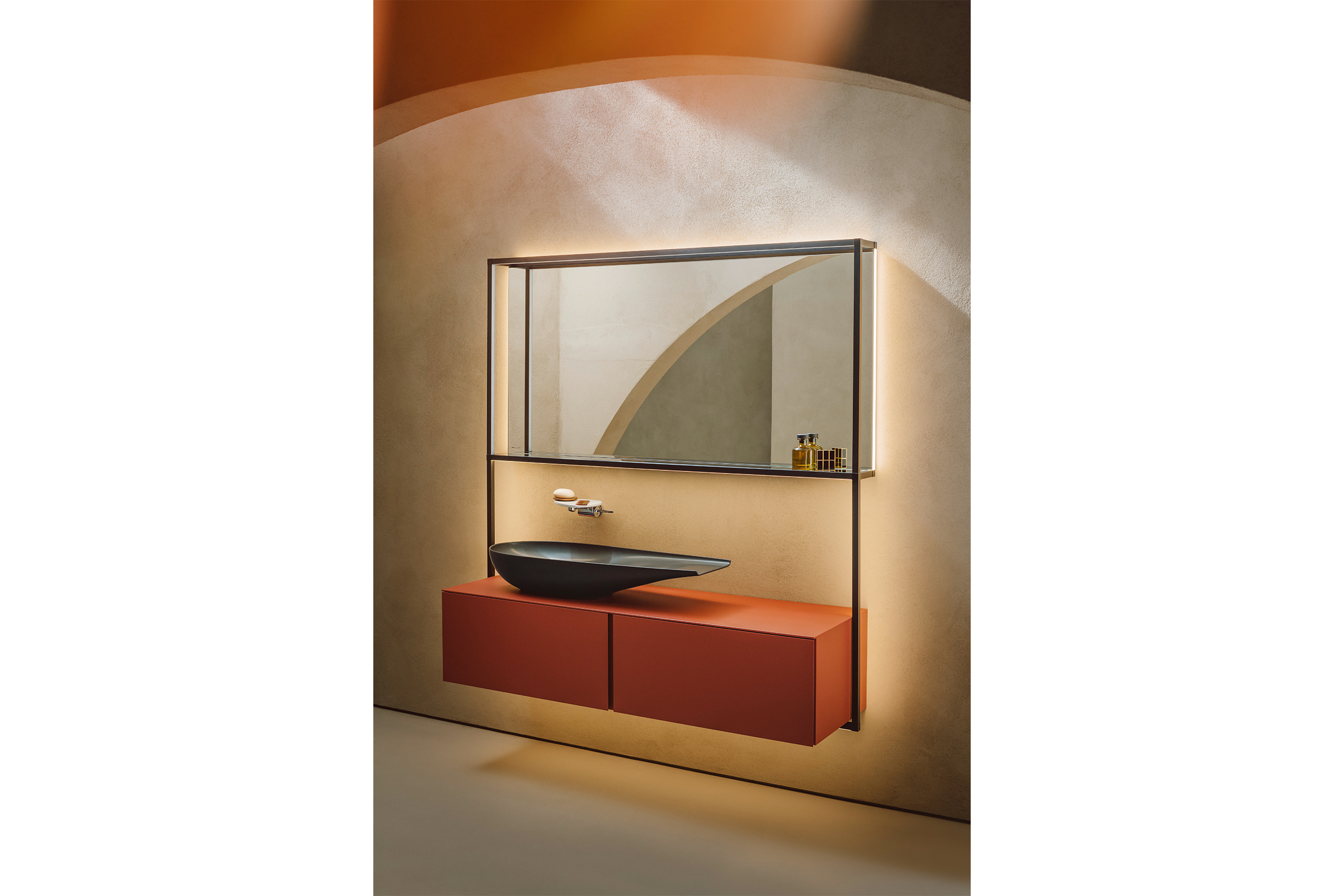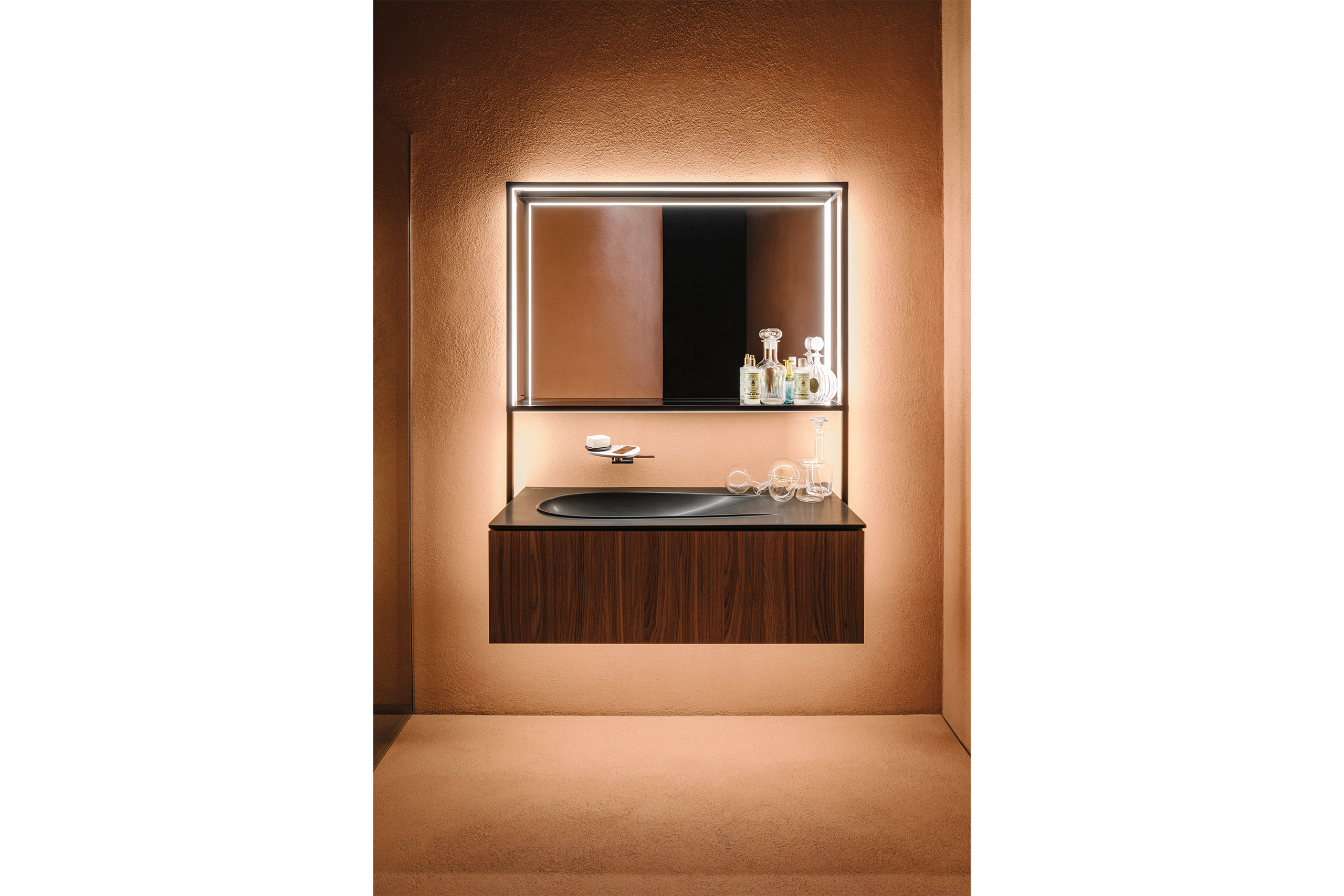 Ein besonderes Highlight befindet sich aktuell noch in der Entwicklung: Eine innovative Rahmenstruktur aus schwarzem Aluminium und mit integriertem LED-Lichtsystem, die Spiegel und Möbel als verbindendes Element umrahmt und sie gekonnt in Szene setzt.