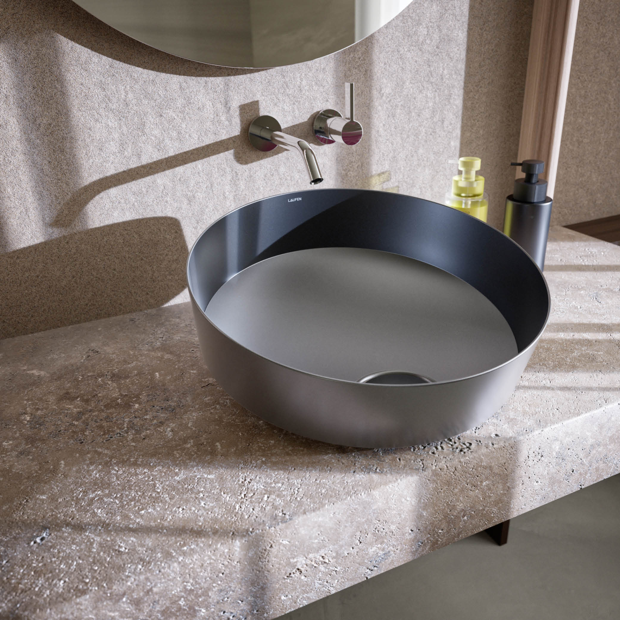 Mit der Integration des Materials glasierter Stahl, bei LAUFEN Vitreon Stahl genannt, vollzieht das Unternehmen einen konsequenten Schritt in Richtung ganzheitliches Bad: Dieses wird als kompletter Lebensraum gedacht – in einer Designsprache und mit einem klaren System. Waschtische aus unterschiedlichen Materialien sowie weitere Badobjekte, Möbel, Armaturen, Spiegel, Beleuchtung, Accessoires und Installationssysteme fügen sich nahtlos zu einem erweiterbaren Gesamtsystem zusammen.
