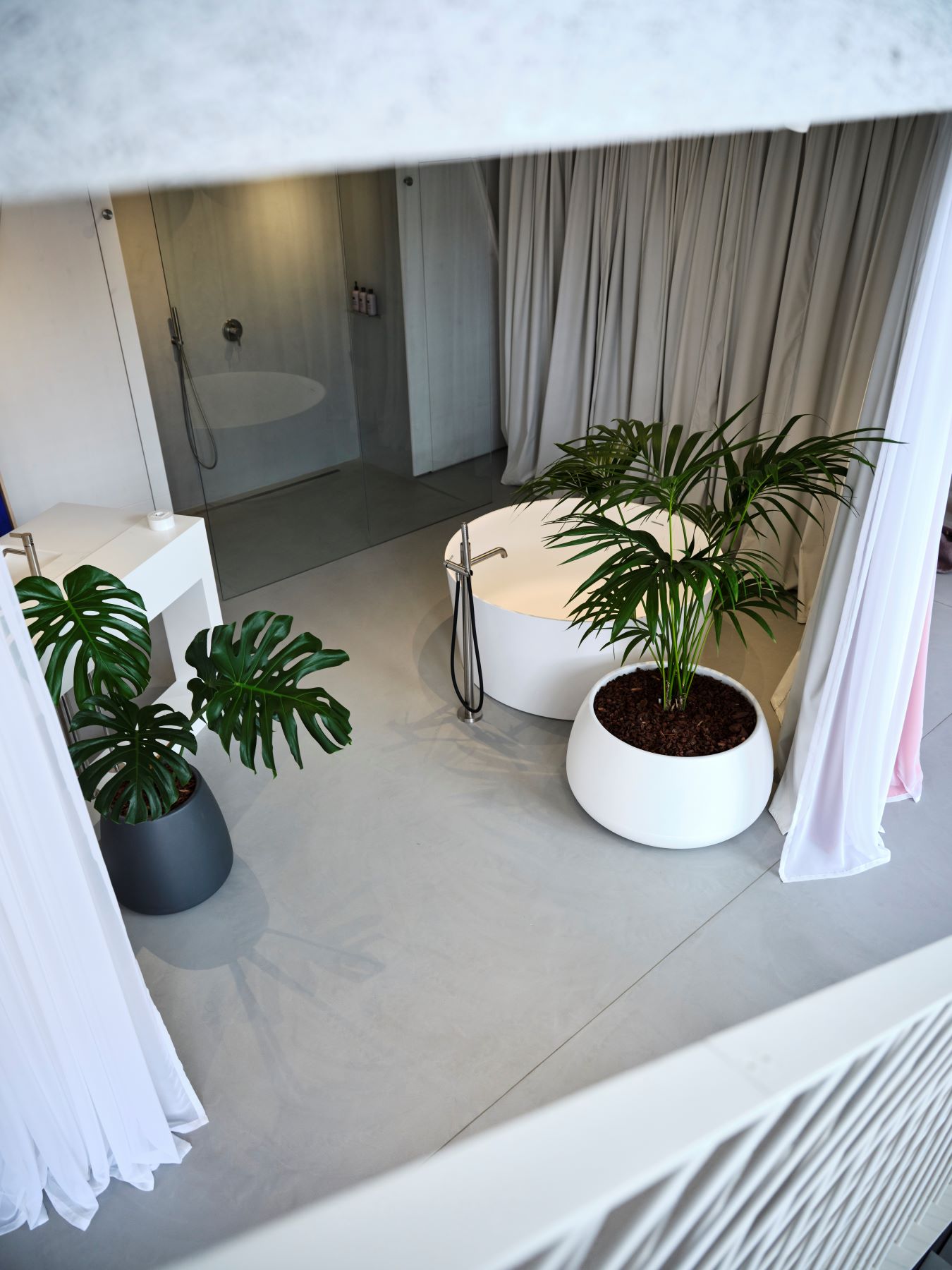 Ergänzt wird das Ensemble durch eine freistehende Badewanne aus der Designkollektion VAL. Gefertigt aus dem hochwertigen Mineralgusswerkstoff Sentec, überzeugt sie durch einfache, architektonische Linien – und fügt sich damit harmonisch in das Gestaltungskonzept von Raphael’s Refugium ein.