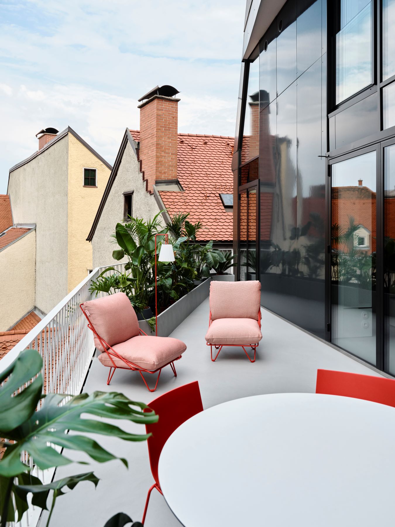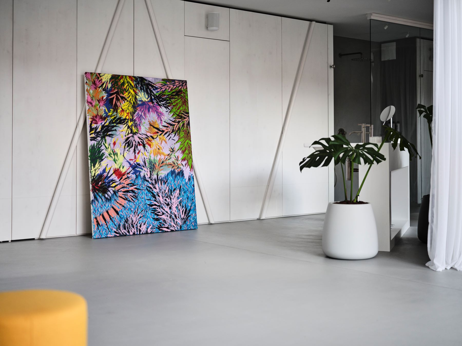Die großzügige, offene Struktur bleibt erhalten, weil alle funktional notwendigen Elemente in einer umlaufenden Wandstruktur verschwinden: Stauraum oder Garderobe – alles integriert und mit spiegelnden Flächen versehen, die den Raum optisch erweitern. Entlang der Fensterfront wird diese Struktur zum bepflanzten Abschluss, der sich über die Glasfront hinweg fortsetzt und so Außen- und Innenraum visuell verbindet. Ein durchgehender Bodenbelag aus hellem Mikrozement vereint Innen- und Außenfläche, großflächige Schiebeelemente öffnen den Raum zur Terrasse.