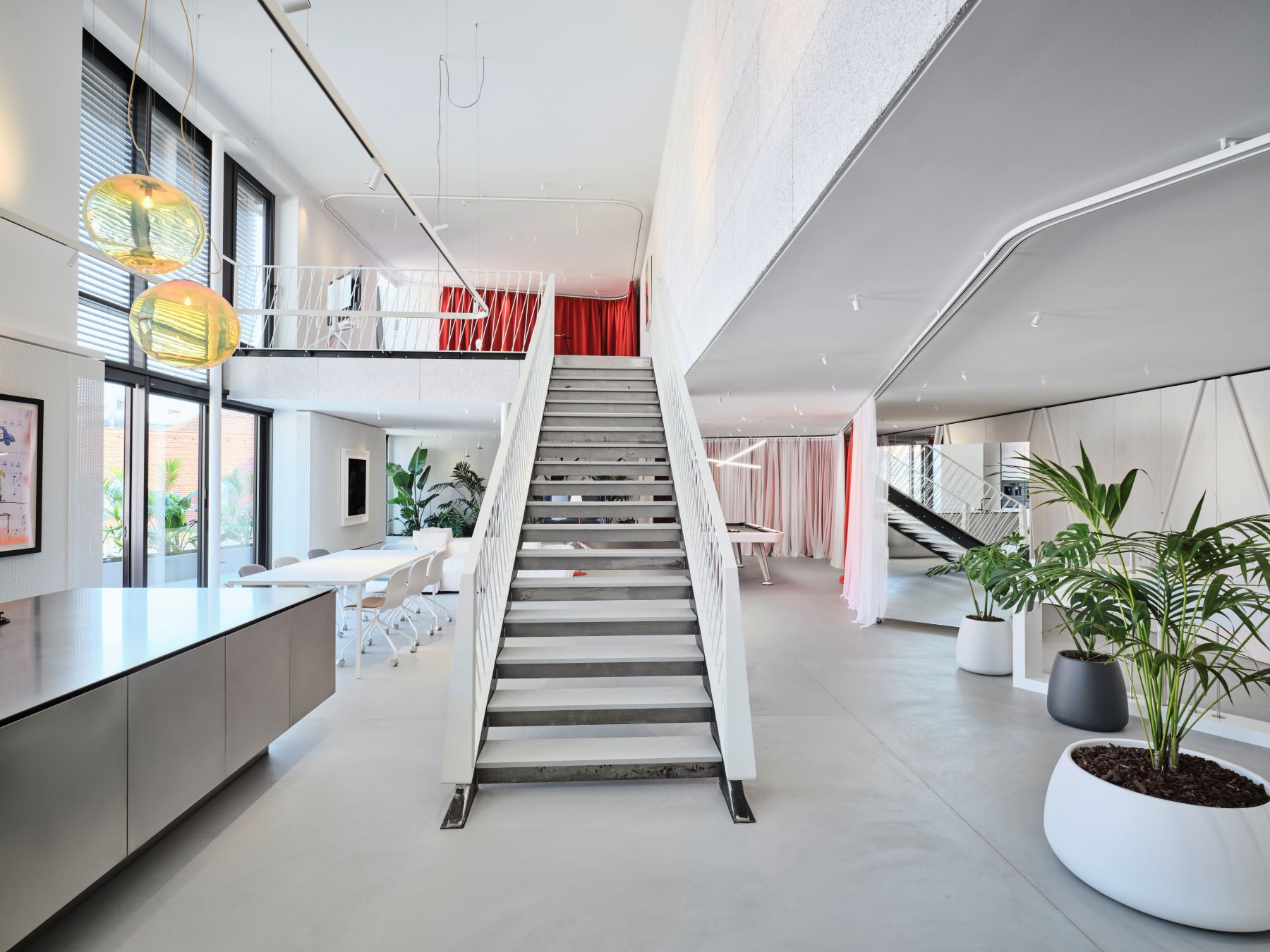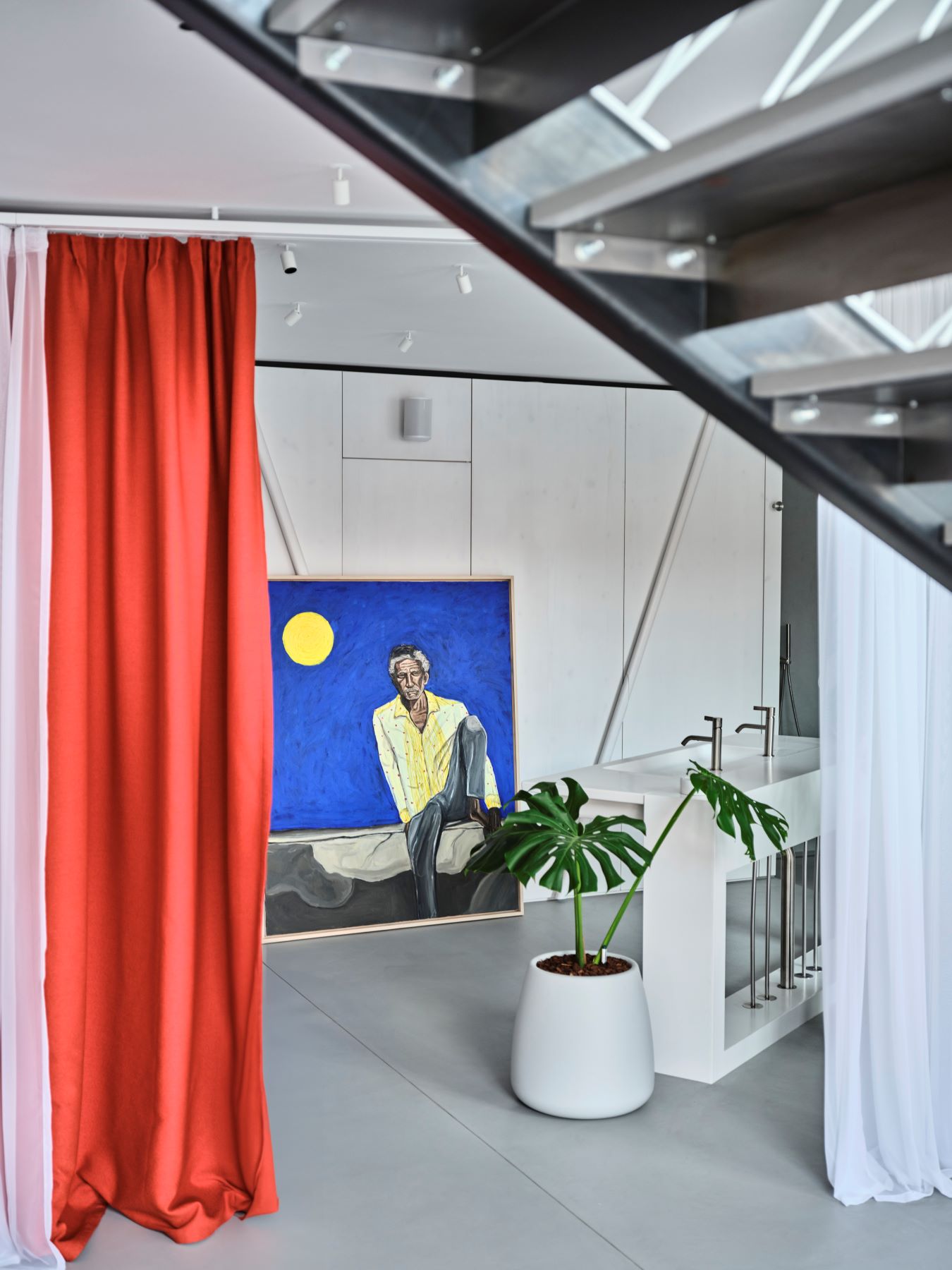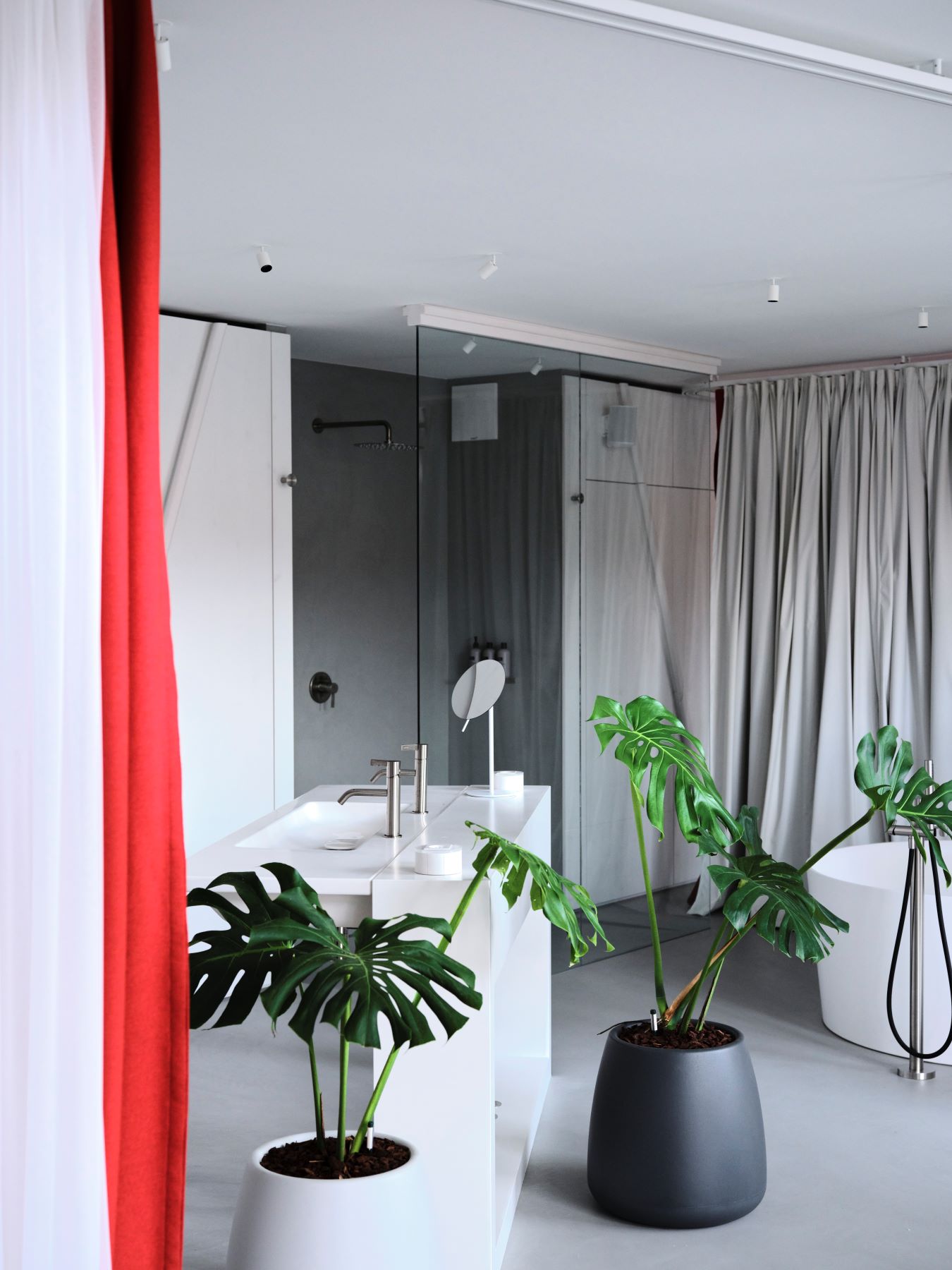 Ein raffiniertes Vorhangsystem erlaubt es, je nach Bedarf Intimität herzustellen oder Offenheit zuzulassen. Zwei geschwungene Linien führen unterschiedliche Stoffschichten – eine semitransparente in Weiß, eine blickdichte in Rot – durch den Raum und ermöglichen ein wandelbares Spiel aus Abgrenzung, Farbe und Licht.