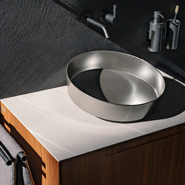 Glatt wie Glas und stark wie Stahl verleiht Vitreon Stahl der Materialwelt von LAUFEN eine neue Dimension und bringt dunklere Töne, metallische Wärme und einen architektonischen Rhythmus mit sich. Eine Materialentwicklung, die das gesamte Badezimmererlebnis vereint.